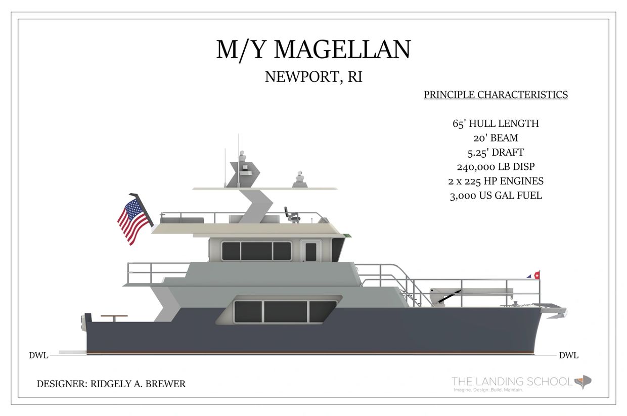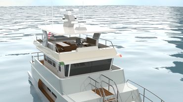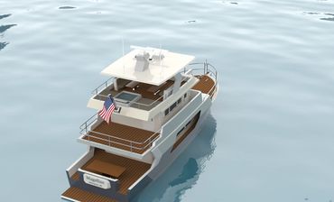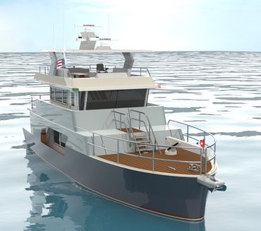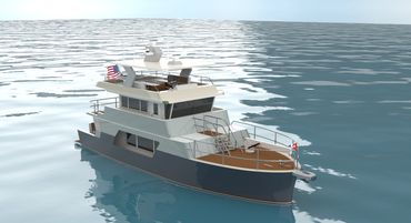 M/Y Magellan, a heavy-duty displacement cruiser designed with range and endurance as top priority. Powered by twin 225 HP John Deere engines, she is designed to cross oceans with a range of over 2500 NM at 8 kts. In order to optimize the range and fuel economy, the hull design process included conducting a series of CFD simulations to find the most efficient bulbous bow geometry. The vessel's accommodations are designed for world cruising in comfort, with a full beam master suite midship and a VIP suite forward. The raised aft pilothouse affords the operator good visibility while staying protected from the elements. There is also ample exterior area, including a flybridge with jacuzzi, sun pads, dining space, and helm station.